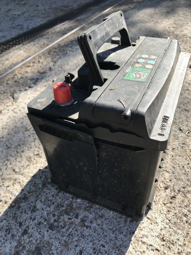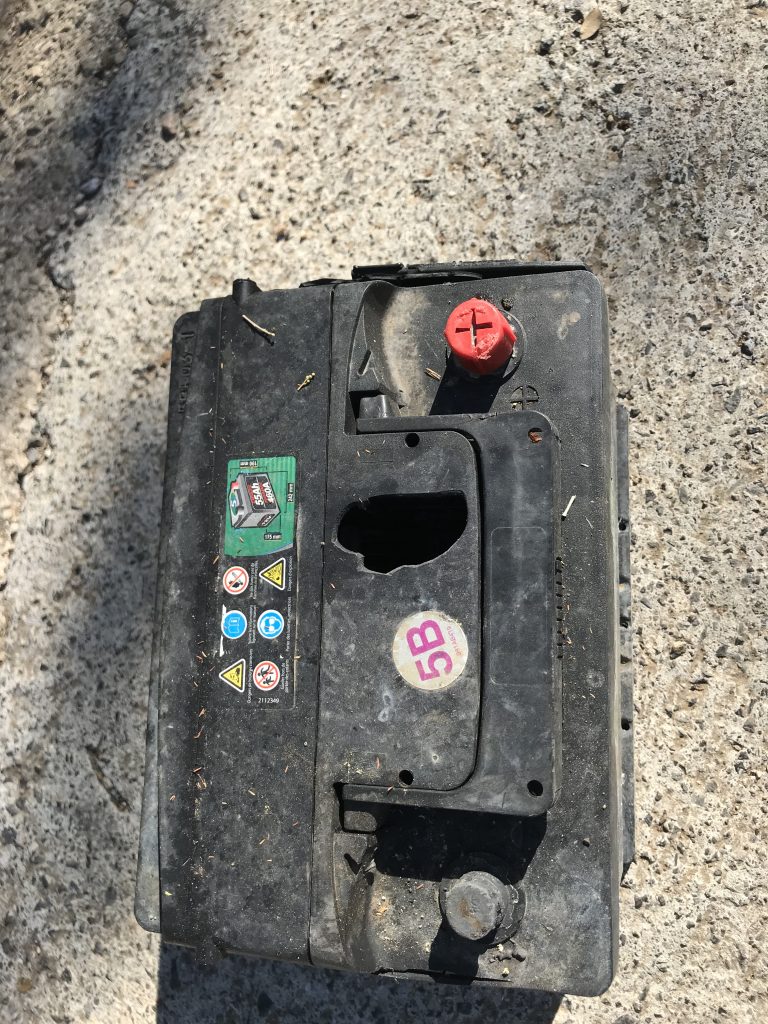 1) – Quelques mois après la restauration, problème du régulateur de tension (un fil s’est coupé). Il y a 2 batteries en série, c’est donc du 24volts. La tension est montée à environ 40volts … et : la batterie a explosé (fendue sur le côté et gros trou au dessus !!!