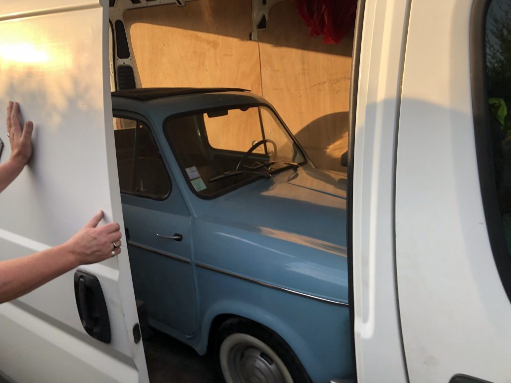 On rentre la vespa dans le fourgon (je n’y croyais pas, mais oui … ça rentre !!!).