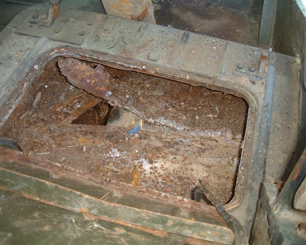 Sous le siège passager, un gros compartiment a outil, ici, il a du se remplir d’eau et la rouille a fait le reste.