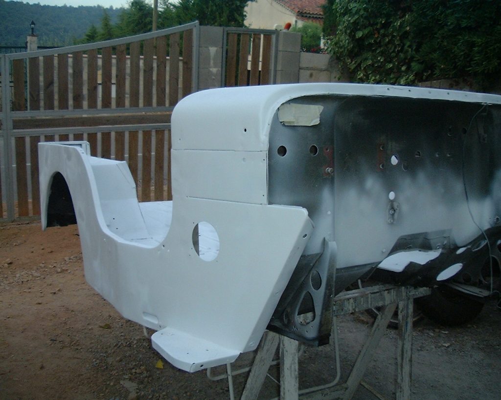 Je fais des gabarits en carton des parties que j’ai découpées, découpe dans une plaque de 2mx1m de 1mm5 d’épaisseur de tôle les équivalences en métal et ajuste sur la caisse.