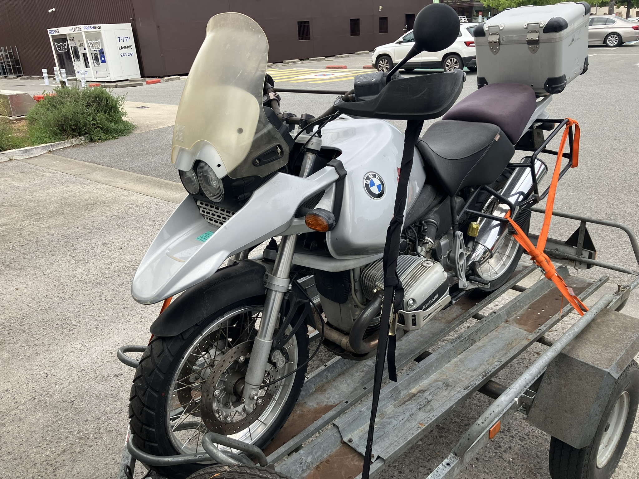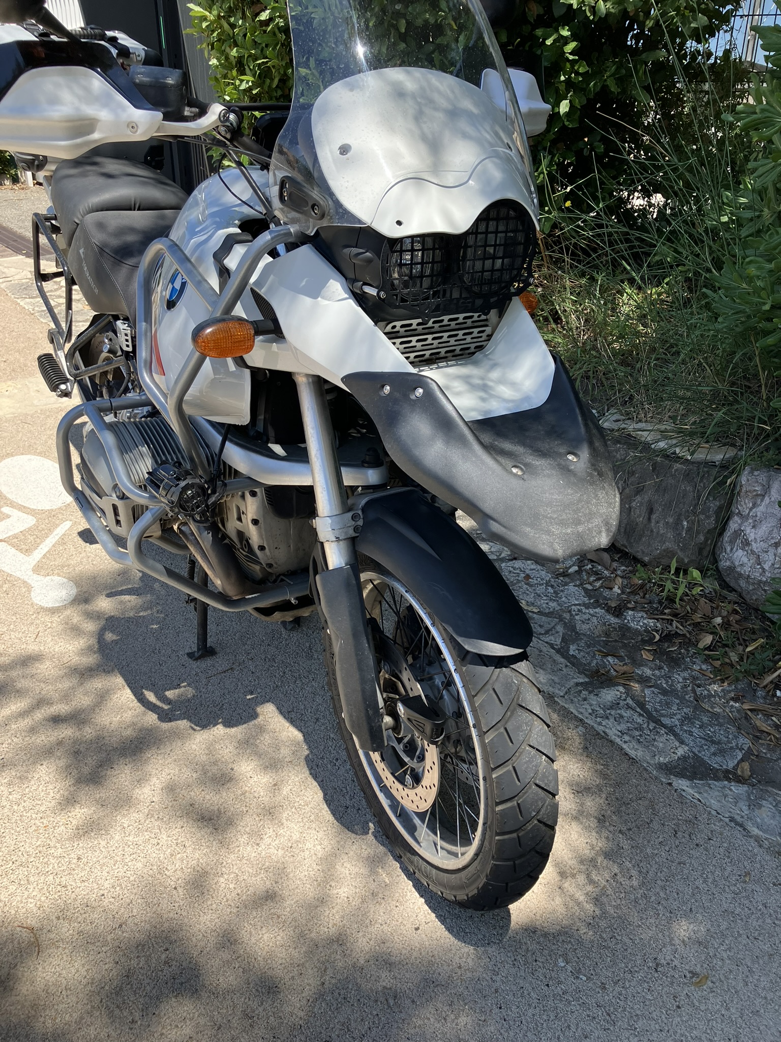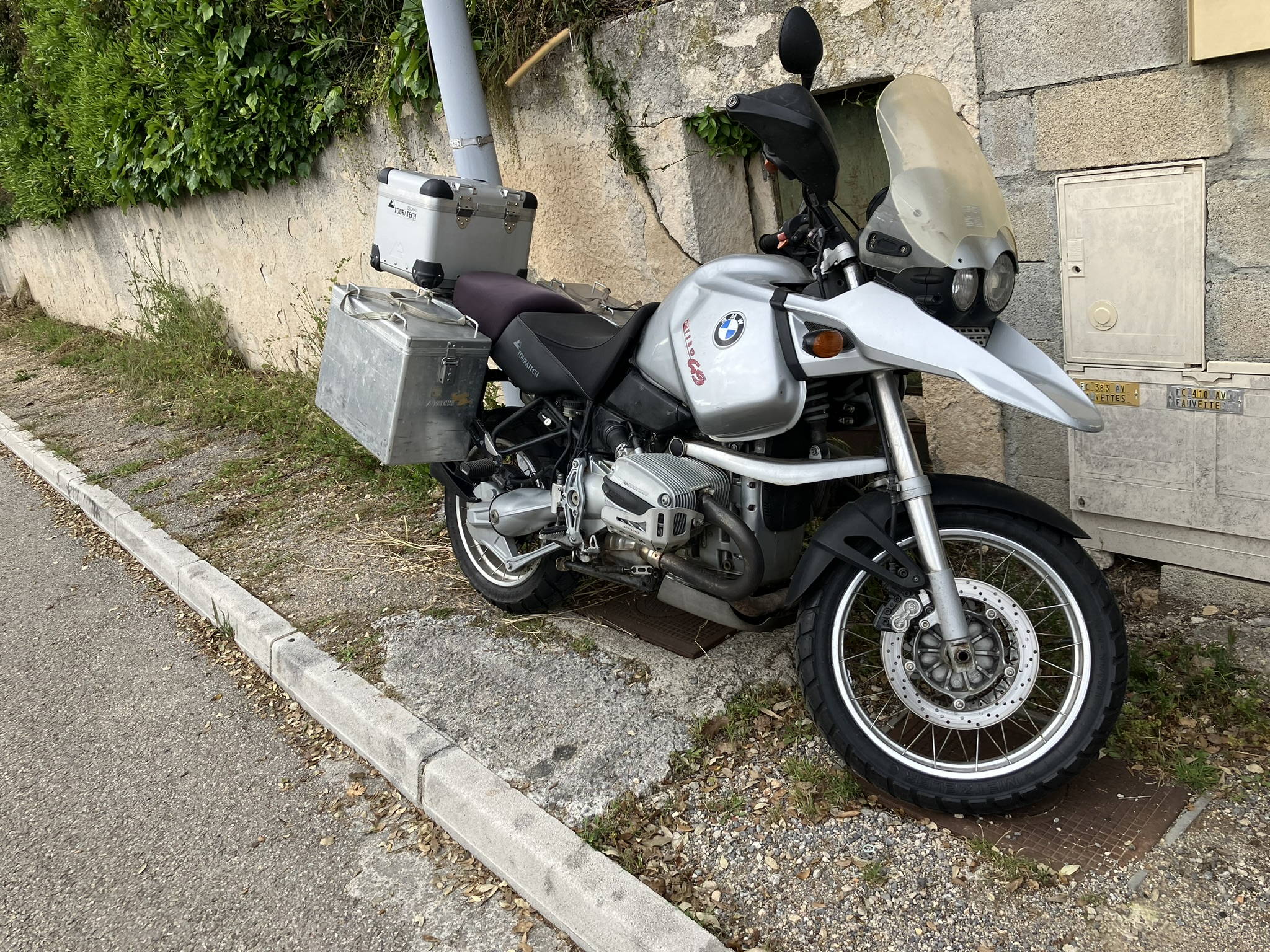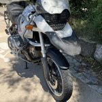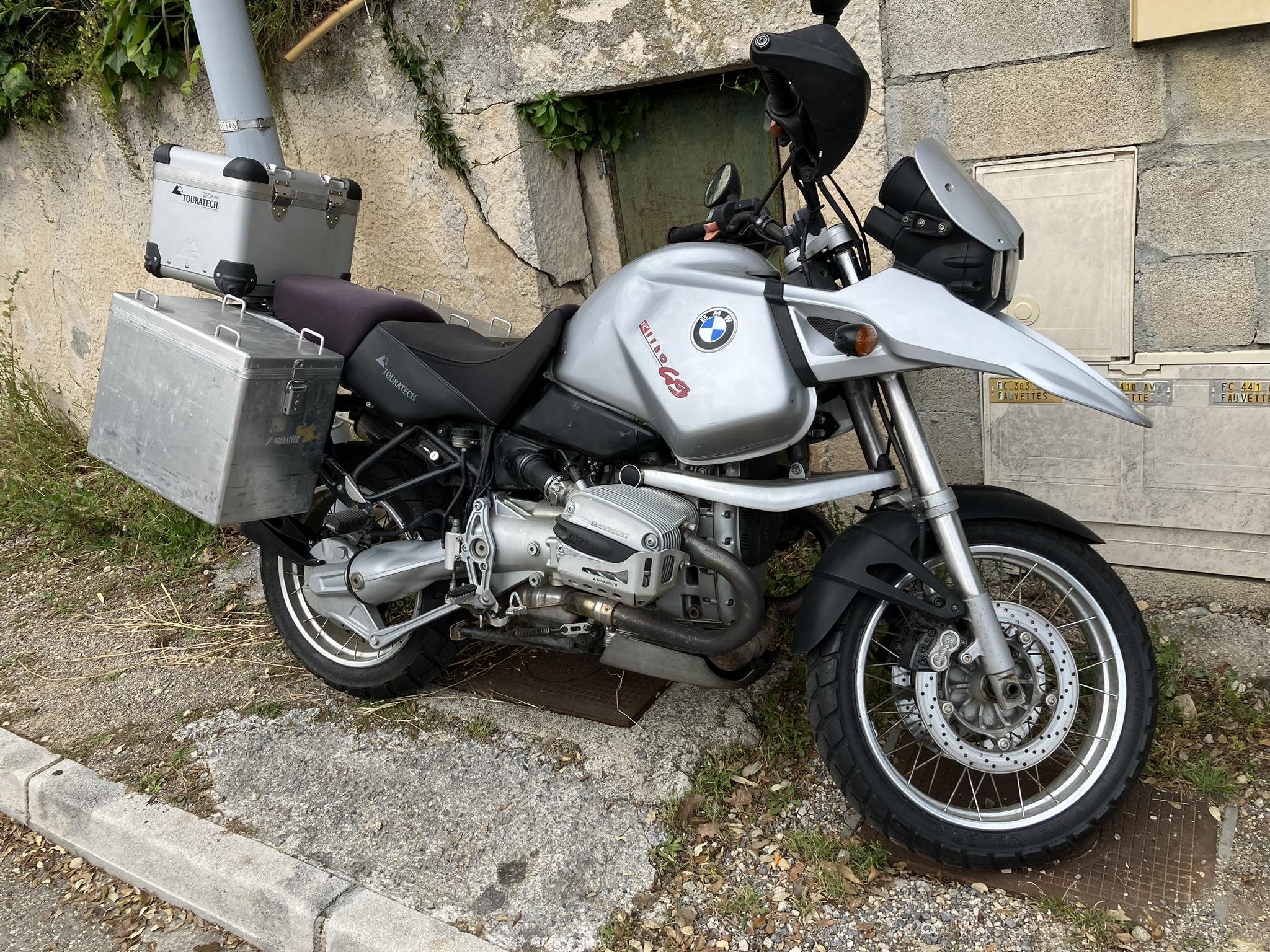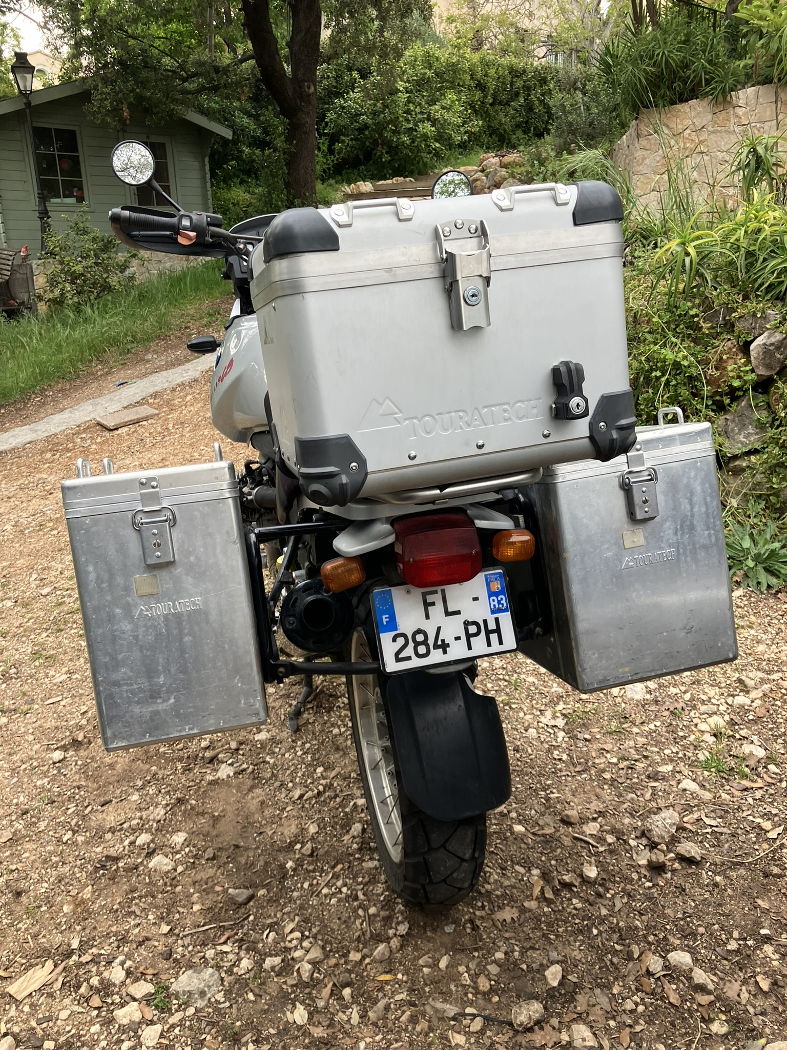 Moto dans un garage et sortie de révision avec pneus neufs. Selle confort touratech. Le réservoir avait pris l’eau car elle était stockée depuis 2 ans dehors (après la révision, le propriétaire a eu un soucis de santé puis opération et ne se sentait plus de remonter dessus, d’où la vente), les durites étaient un peu craquelées et le contacteur béquille avait un soucis, bref, j’ai pu faire 30 mètres avec pour l ‘essayer avant qu’elle cale, monnayer un peu le prix (qui était 200 € plus haut = demander les 3 top case) … et j’embarque le tout.
